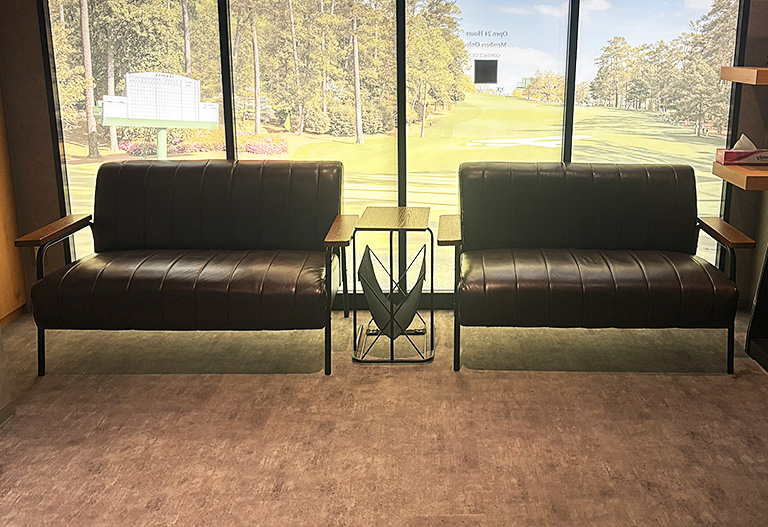 ゴルフレンジの後ろにはソファーとミニテーブルを完備。途中でドリンクを飲みながら一息ついたり、ゲストとラウンドの合間に談笑したり。
