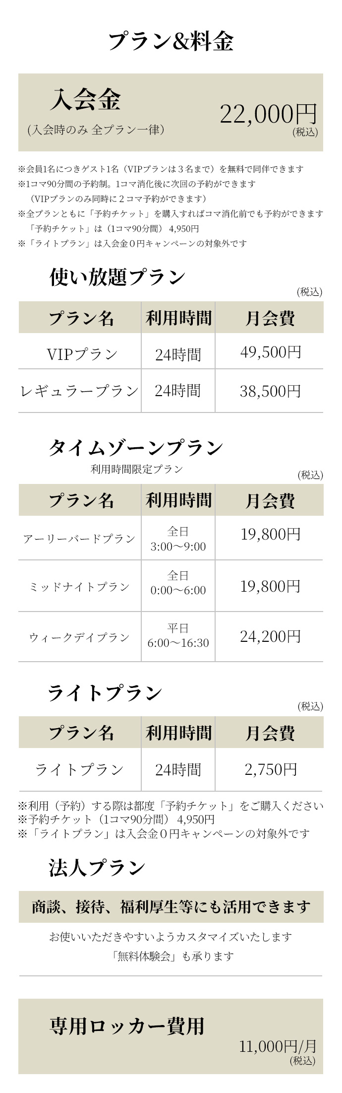 その他のプランの会員は空き状況により月額料金の他に追加料金を支払うことで2コマ連続で予約ができます。